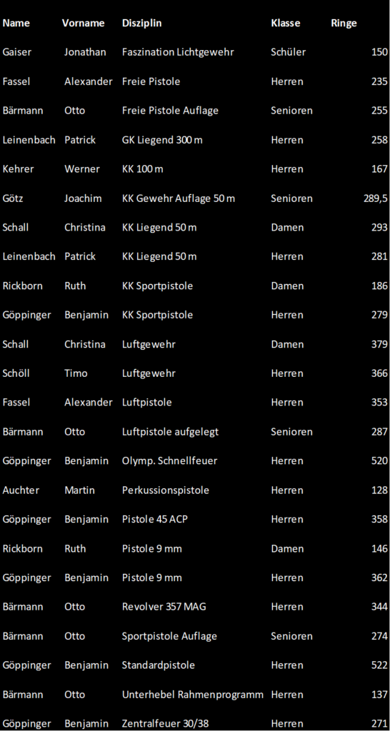 | 1 | Bärmann, Otto | Luftpistole aufgelegt | Senioren V | 302,9 |